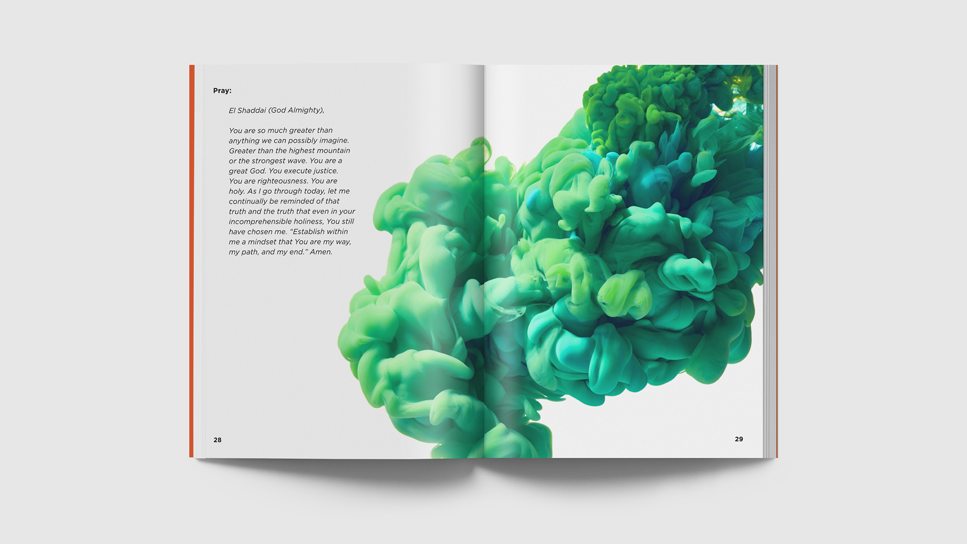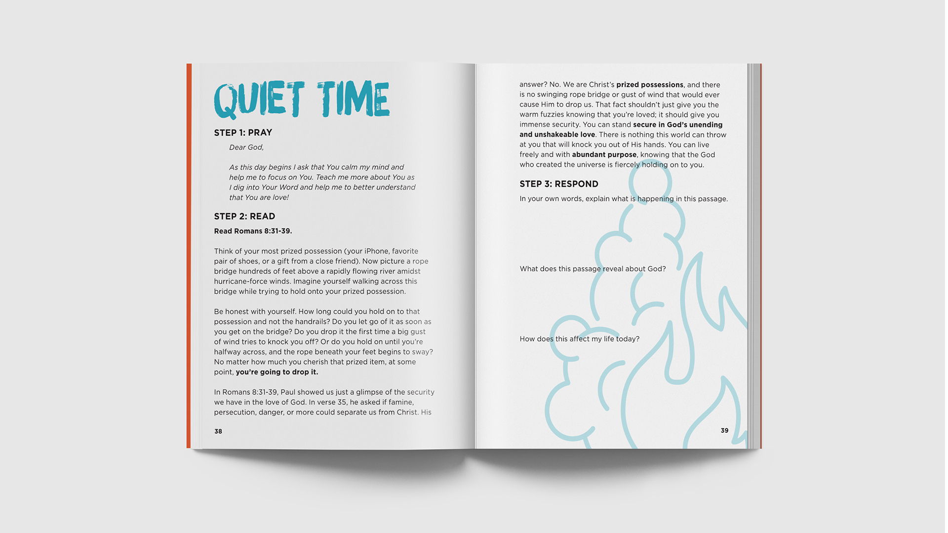 The visuals of the 2018 Student Guide for Student Life Camp were based on paint in water. An image was chosen as the primary shape and an illustrated version was designed (as seen on the cover). Each day had an associated story/element and the icons for each daily theme matched the general shape of the main image. Each daily theme also had a designated color that was used for the corresponding sections of the book. These were also used at the live event to flood the stage on each corresponding night.