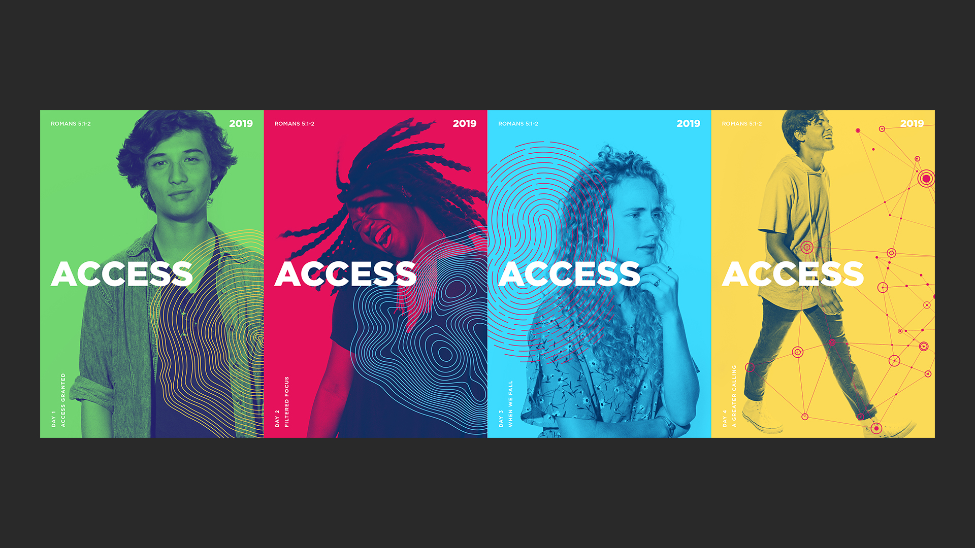 This graphic was created for a youth-centric audience. The color gradients add a modern asthetic. A poster was made to correspond to the themes of each day. The monoline textures refelect an aspect of that day (tree rings, topographical map, fingerprint, conection points). The 2019 Student Guide is another execution of the theme of ACCESS.