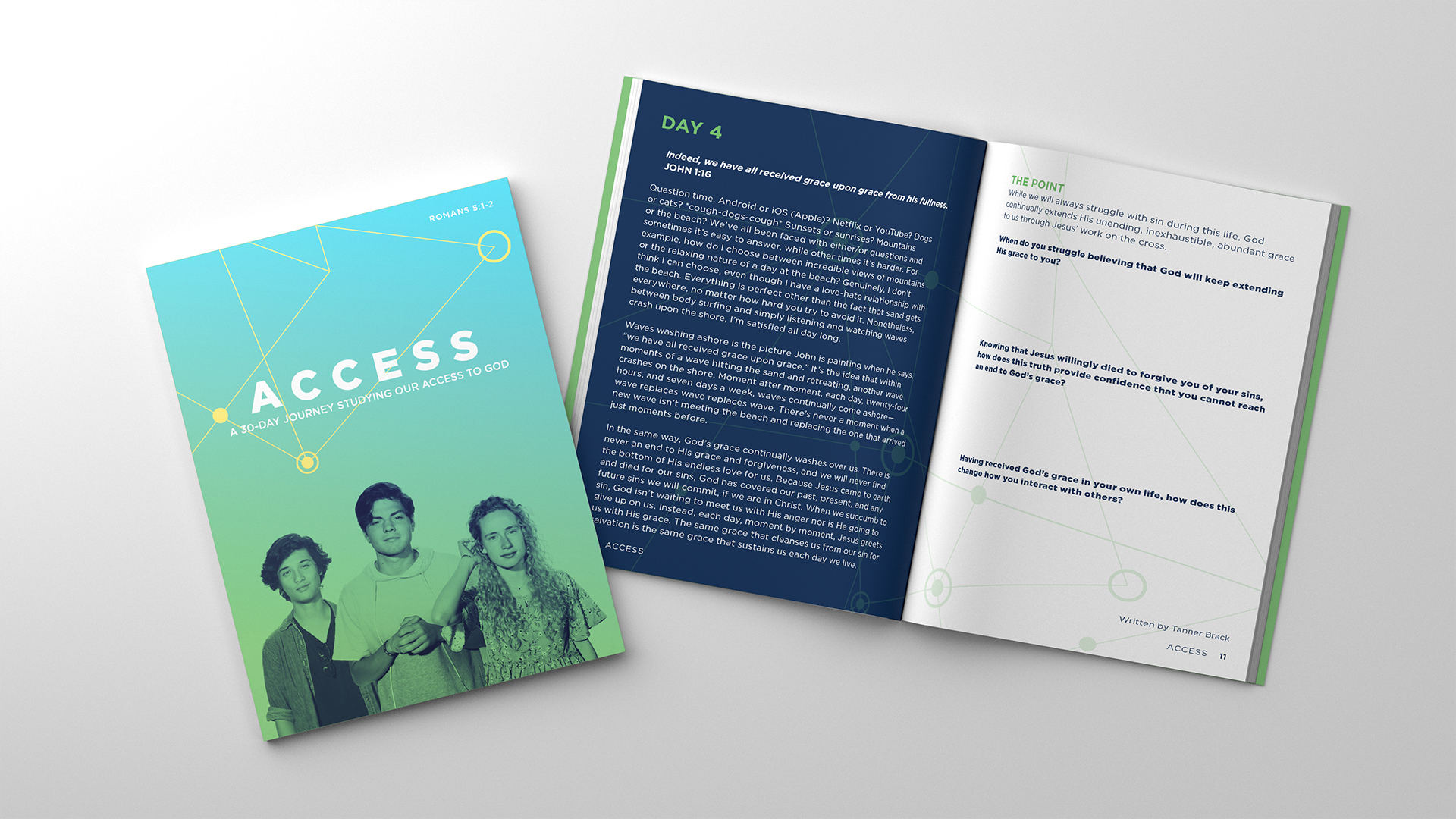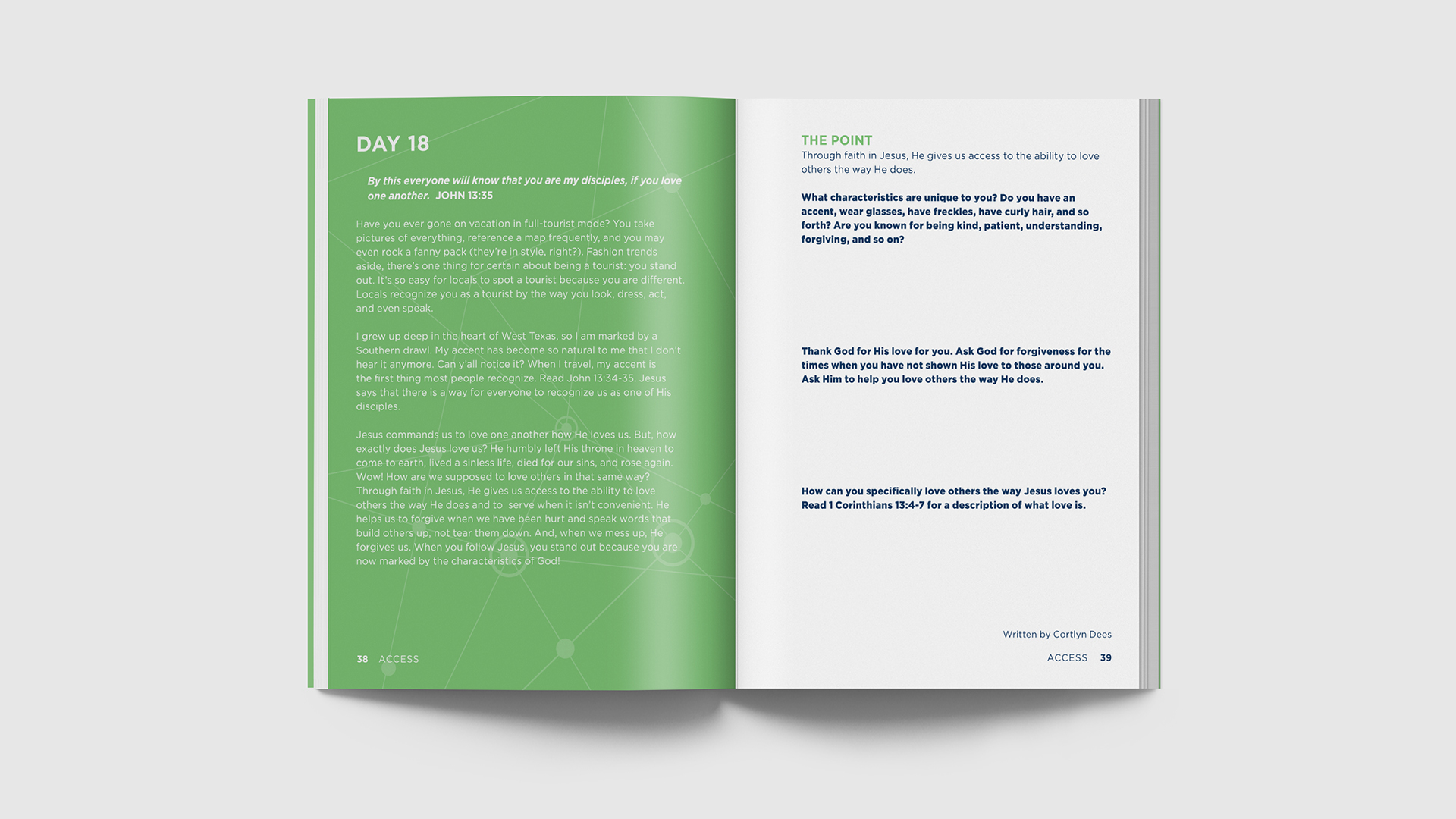 A 30-day devotional guide was written to take the theme material to a deeper level. Basic elements of the theme (as opposed to all theme elements) were used in this piece because it had a longer lifespan than the theme itself. It needed to connect without being overly complicated.
