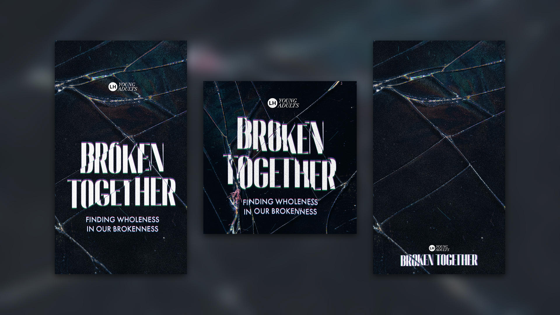 This piece was built as a template so that the text could be easily moved or edited from a single layer, while maintaining all of the appropriate visual shifts simulating the effect of reading through broken glass.