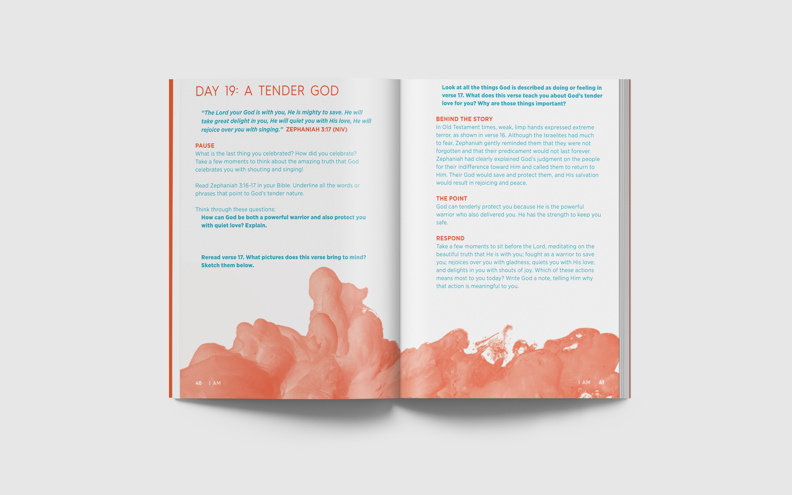 The I AM Devotional Guide is a collection of 30 daily devotionals written for students with the intention of increasing their understanding of God and His character. The design was based on a theme image and style.